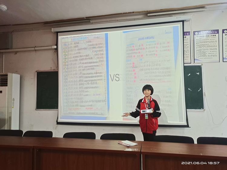 6月4日,主题活动迎来了一个新的高潮,年级组“21天时间管理经验分享会”如期举行。各班10名代表齐聚综合楼四楼,代表们有序入场,坐姿端正,严守纪律,认真笔记。