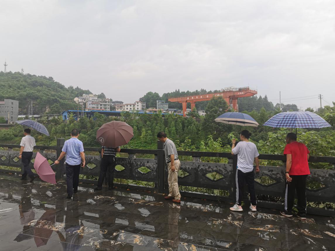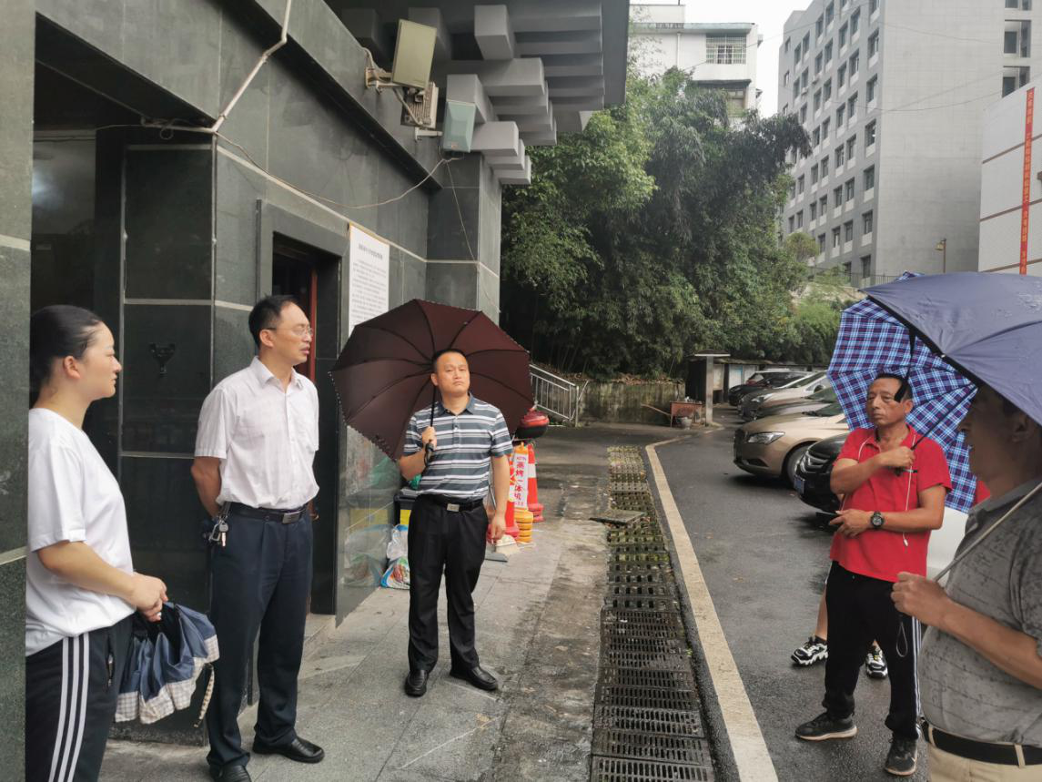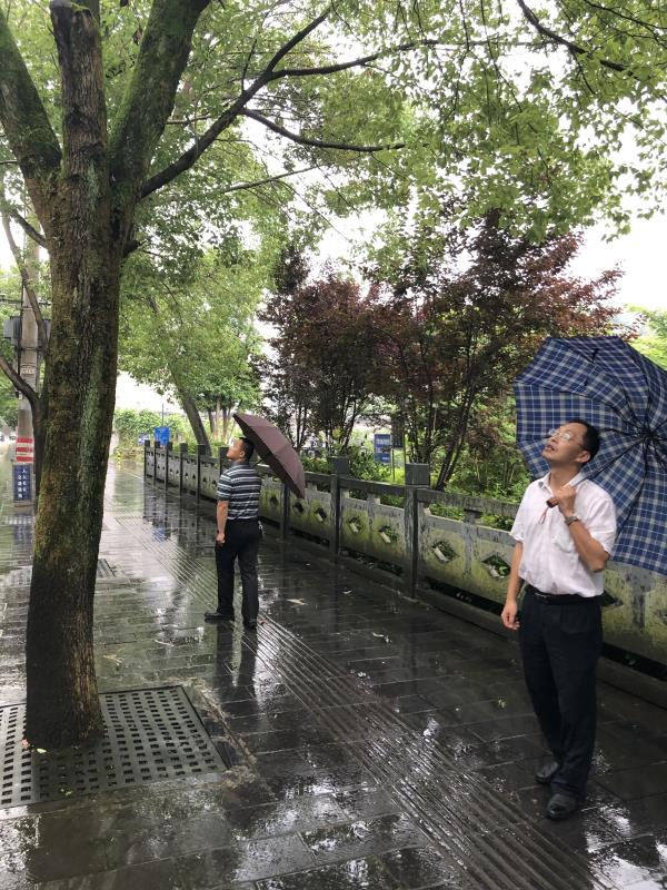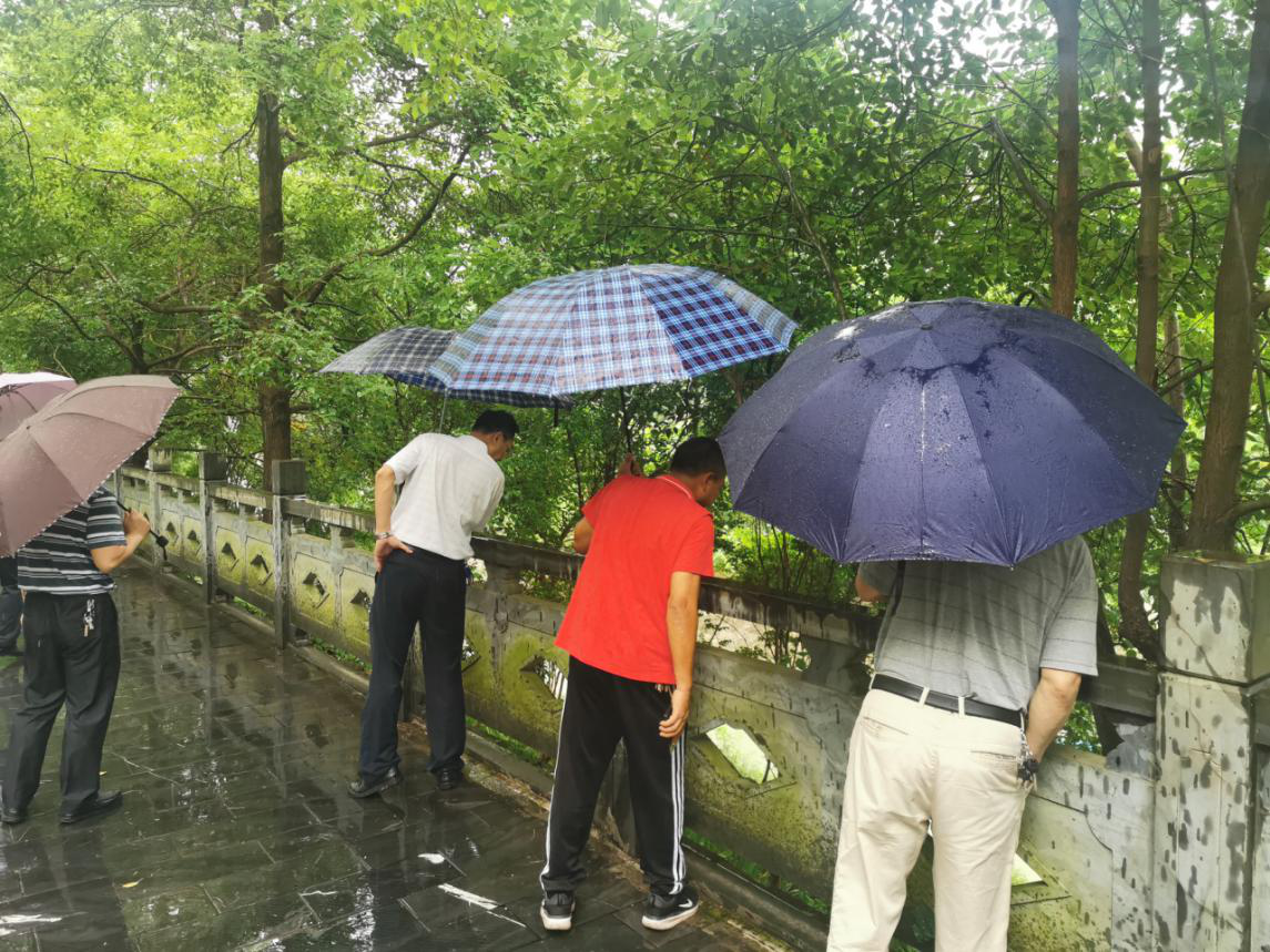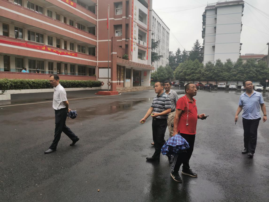 图为在校长麻二平带领下,校长助理钱芾生、校办、后勤、教务处、政教处对汛期期间校园内及校园周边进行安全隐患排查,全力做好校园安全工作。