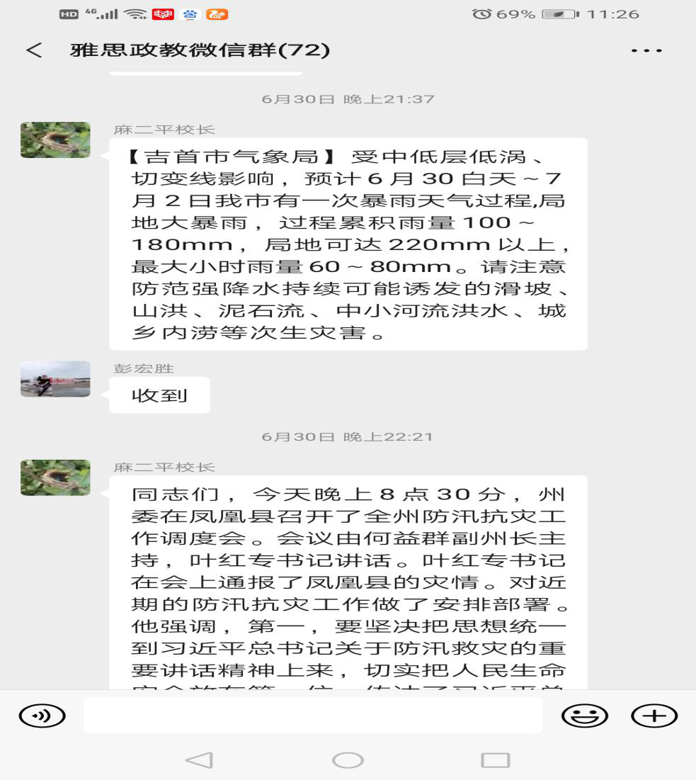 学校安全重于泰山,学校安全工作是我校工作重中之重,特别是随着汛期来临,持续的强降雨天气,为预防可能发生地质自然灾害,湘西雅思实验学校初中部严格落实上级部门安全工作会议精神要求,及时安排部署,开展安全隐患大排查,抓好汛期安全防范工作。