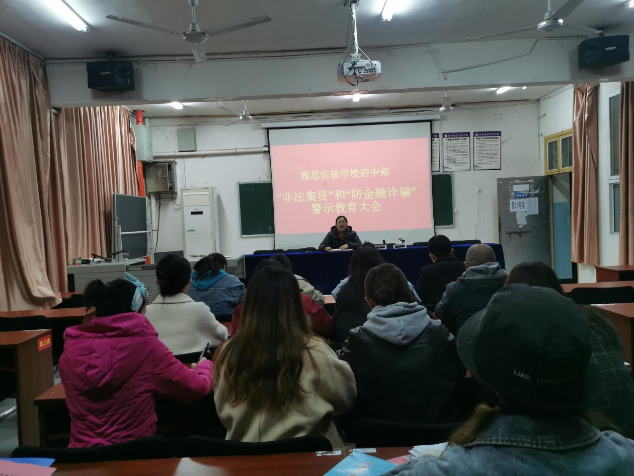 为加强和巩固师生识别非法集资、防金融诈骗知识,防止我校师生财产安全受到侵害,11月21日晚,湘西雅思实验学校初中部对老师举行“非法集资”“防金融诈骗”警示教育大会和全校学生进行防范“校园贷”为主题的安全教育。