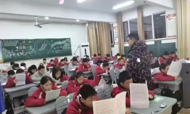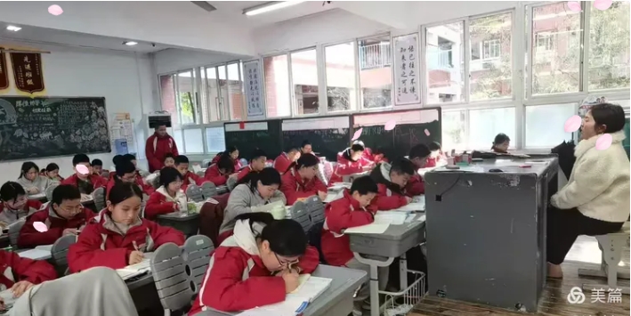 教室里,红色校服的身影整齐排列,学生们低头专注于习题,时而皱眉思考,时而奋笔疾书。黑板上"梦想起航"的标语在晨光中格外醒目,仿佛在默默为孩子们加油鼓劲。各科老师早早来到学校,或在讲台上梳理知识点,或走到学生身边俯身指导,用行动诠释着责任与担当。