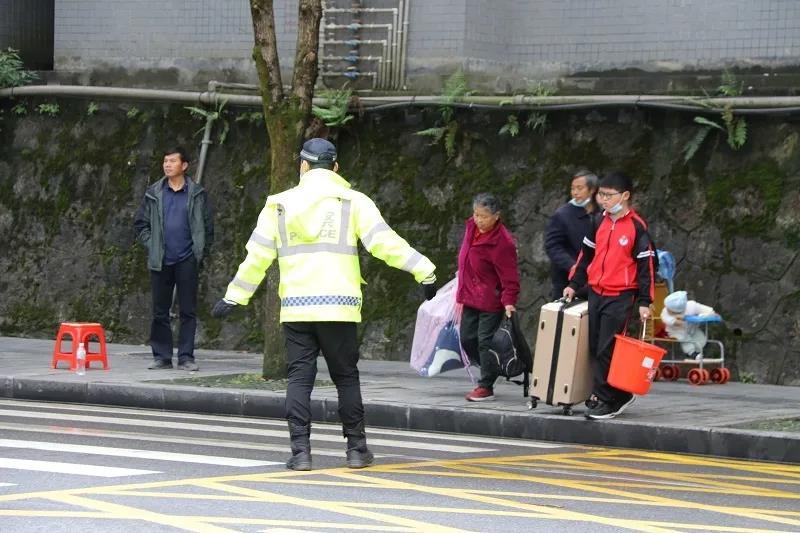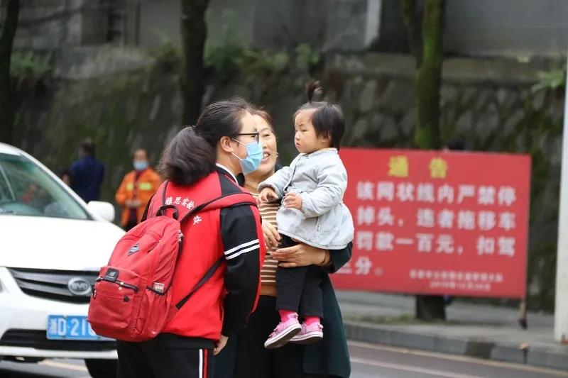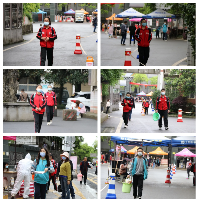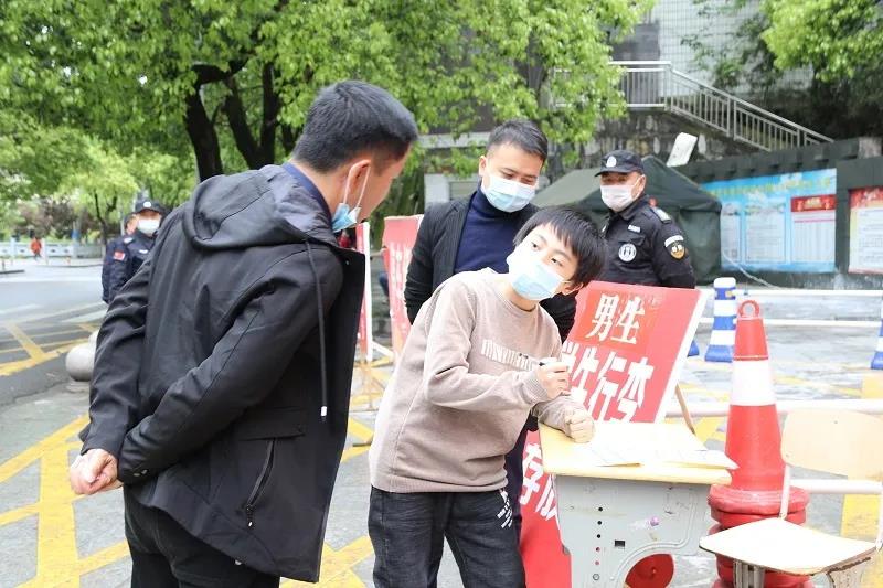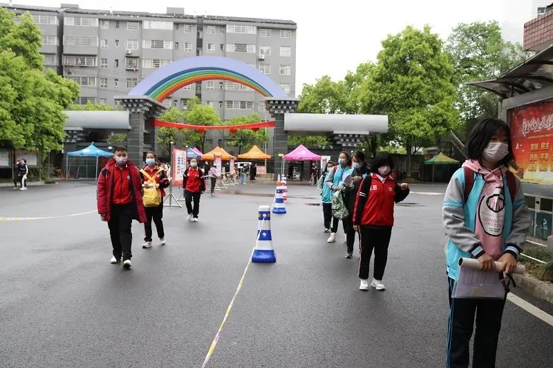 早上7:40,由两校教师化身成的路队指导员、消毒防护员、体温检测员、行李搬运工等全体工作人员已经到岗到位,等候学生到来。8点左右,学生在家长的陪送下陆续到来,开始了久违的校园生活。在学校的组织下,学生至少间隔1米的距离排队,通过体温检测、消毒后有序地进入校园,并按要求有序前往寝室安置、教室报到。