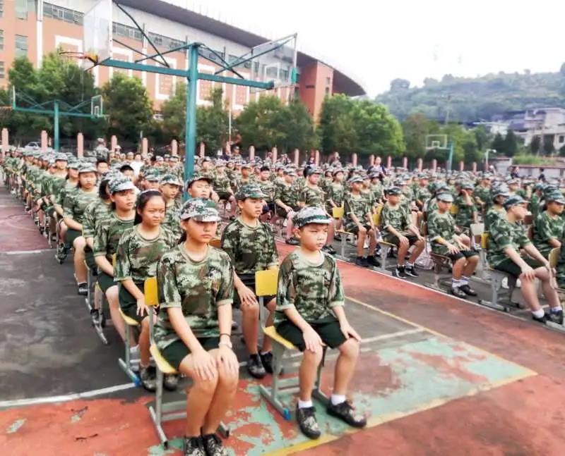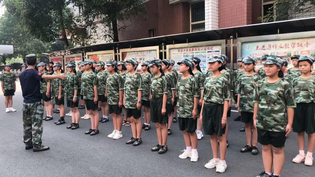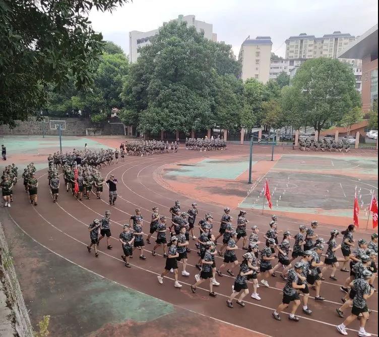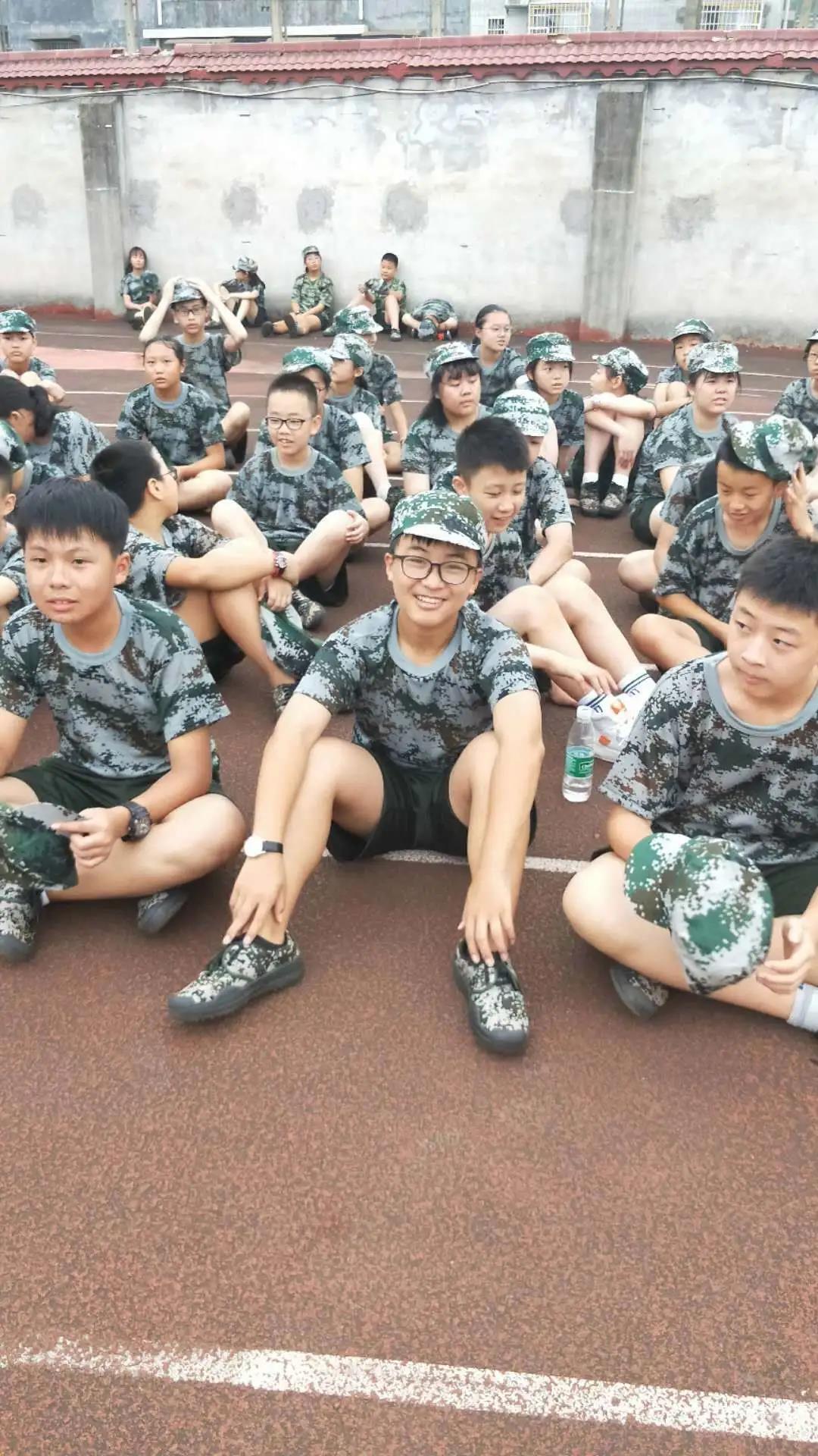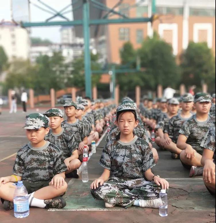 头顶烈日,依然团坐如钟。汗水也撼动不了初一新生们坚强的意志。