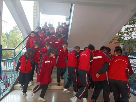 在模拟火灾逃生演练行动时,学生们低着头、弯着腰、用衣服捂口鼻,迅速撤离到安全地带(雅思初中后操坪、A栋大操坪),用时共3分钟41秒。本次演练明确了逃生路线和正确逃生方法,强化了师生的消防意识。