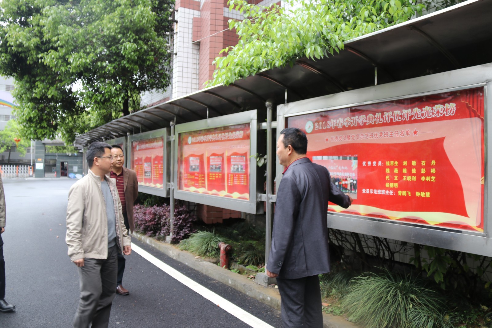 刘冰一行在学校党支部书记雷家武、副校长麻二平、校长助理钱芾生、毛国及党支部副书记刘敏等的陪同下查看了学校的办学环境、党建宣传橱窗。随后,领导们来到学校党员活动室,认真查看了党建工作材料,对学校布置规整的党员活动室给予点赞。