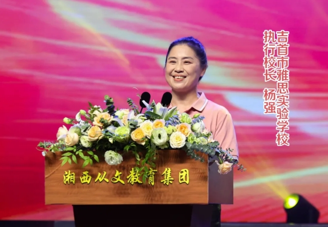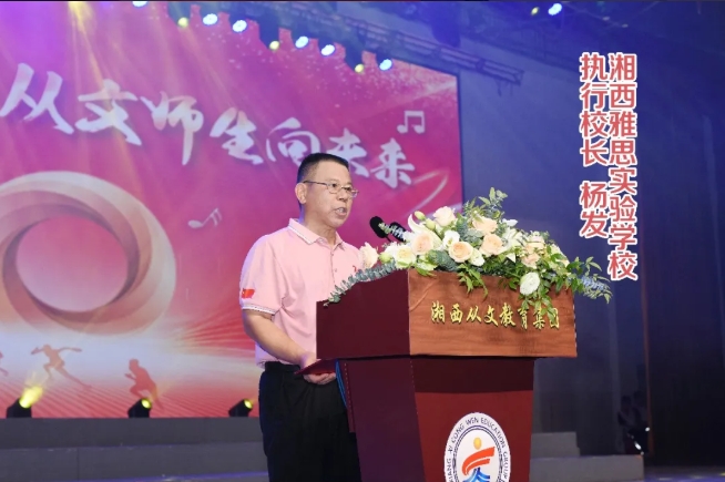 谷韵民族小学执行校长魏薇、吉首市雅思实验学校执行校长杨强、湘西雅思实验学校执行校长杨发分别上台致辞。回顾学校20年深耕教育、培育了无数名人才,未来将聚焦学科升级与育人质量提升,打造更优质的教育平台,同时向历代教职工、校友及支持单位表达诚挚感谢。
