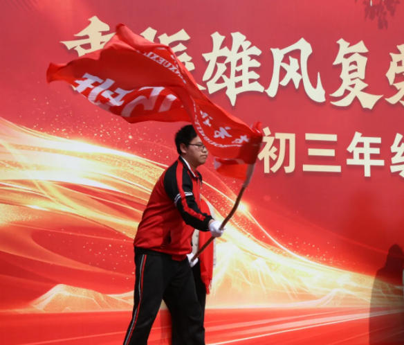 随后,执行校长杨强依次为初三各班授予班旗。鲜红的班旗在风中猎猎作响,象征着班级冲刺的使命感与凝聚力,也标志着百日征程正式“亮剑”。